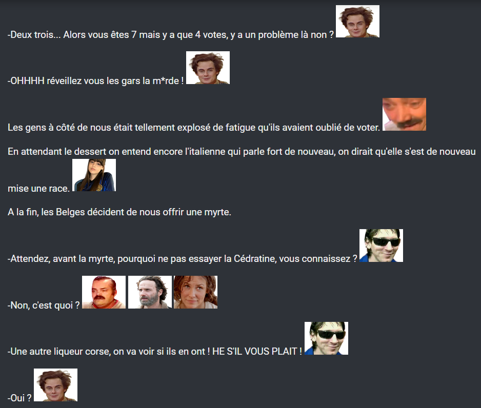 En rejoignant ma place je remarque qu'on est à la table juste à côté de l'italienne qui continue à se mettre des races, ils sont nombreux à la table. Bah dis donc, elle en met de l'ambiance celle-là, elle n'est pas introvertie...
