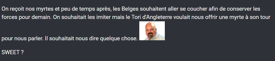 On reçoit nos myrtes et peu de temps après, les Belges souhaitent aller se coucher afin de conserver les forces pour demain. On souhaitait les imiter mais le Tori d'Angleterre voulait nous offrir une myrte à son tour pour nous parler. Il souhaitait nous dire quelque chose.