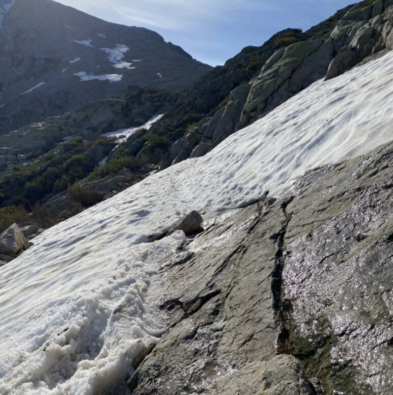 On continue notre ascension, on passe dans des endroits un peu dangereux et glissant à cause des cascades, mais pour l'instant ça va. Plus loin on rencontre un premier névé. Enfin ! Léo est ultra content de retrouver la neige, il pose ses mains dedans pour remercier la montagne.