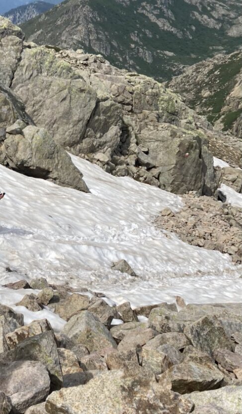 -Bon allez on vous laisse et attention dans la descente tous, parce que... les névés sont beaucoup plus long à ce que je vois, et trèèèèès raide, vraiment soyez vigilant...