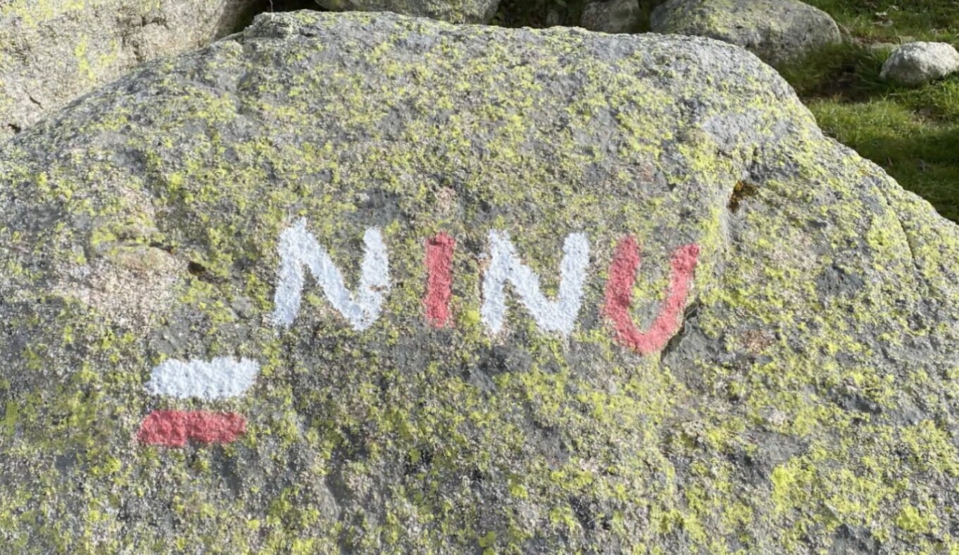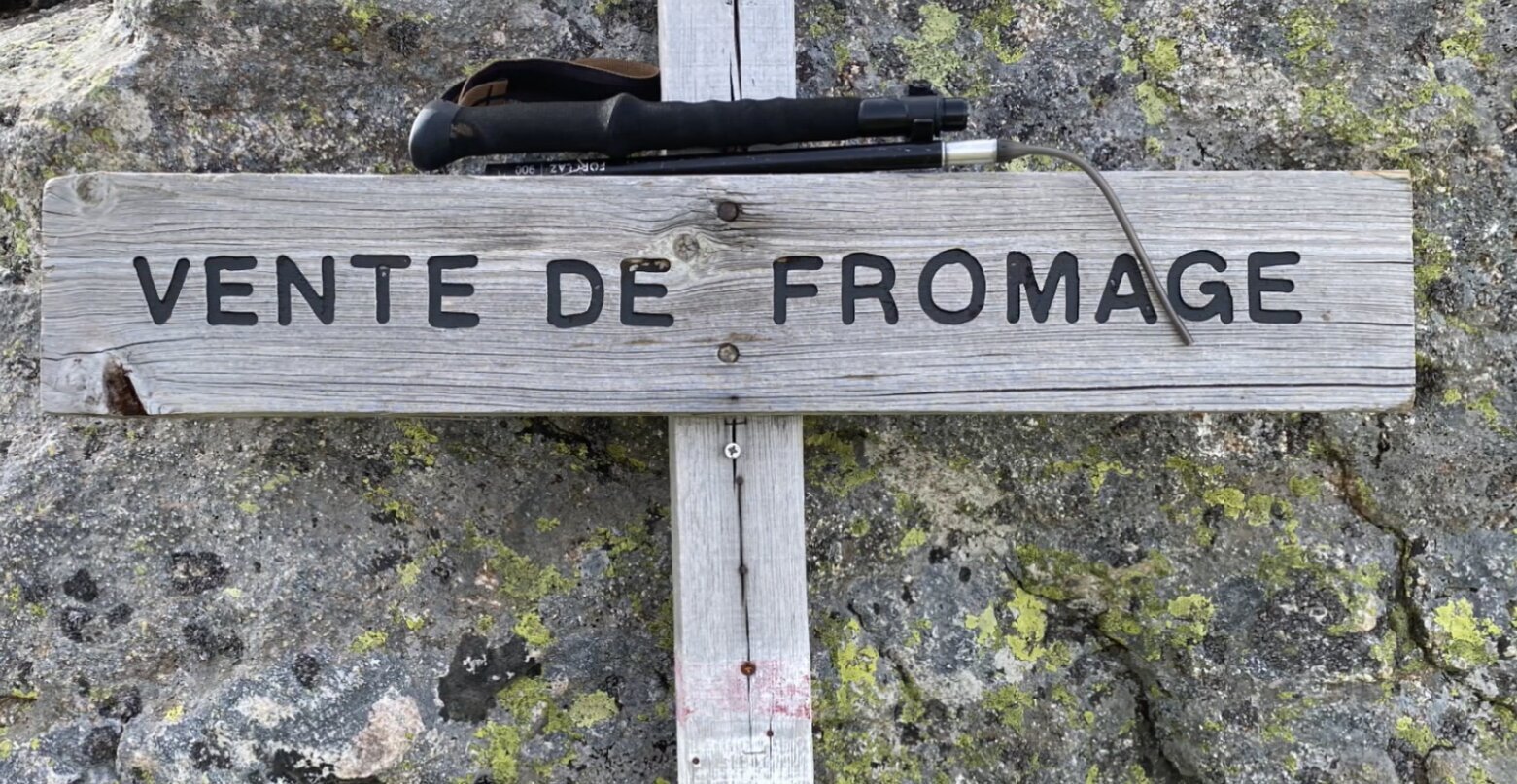 C'est exactement au niveau de ce mĂȘme rocher qu'un panneau "vente de fromages" est prĂ©sent. Un gars a mĂȘme laissĂ© ses bĂątons dessus, surement des bĂątons cassĂ©s par la terrible, dure et cruelle loi du GR20 comme dirait l'autre