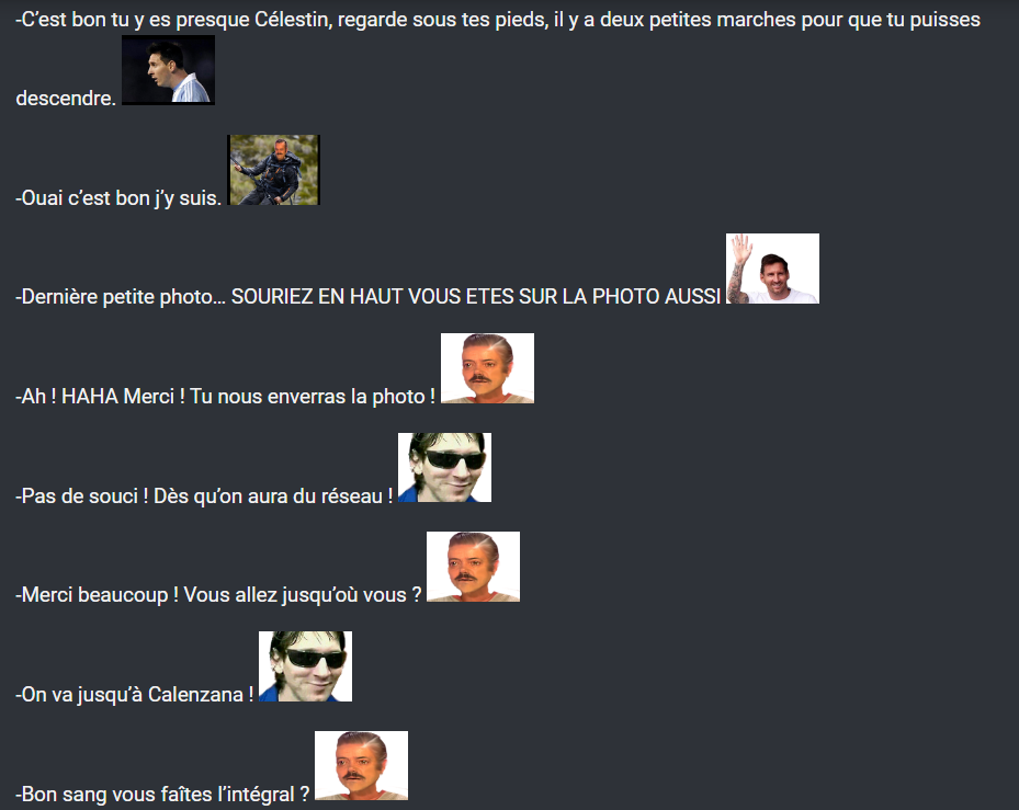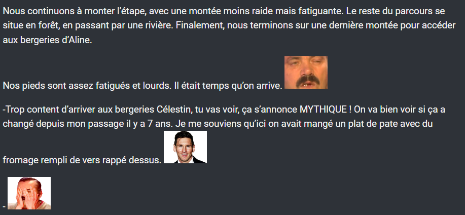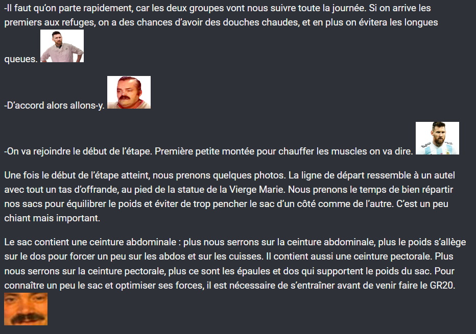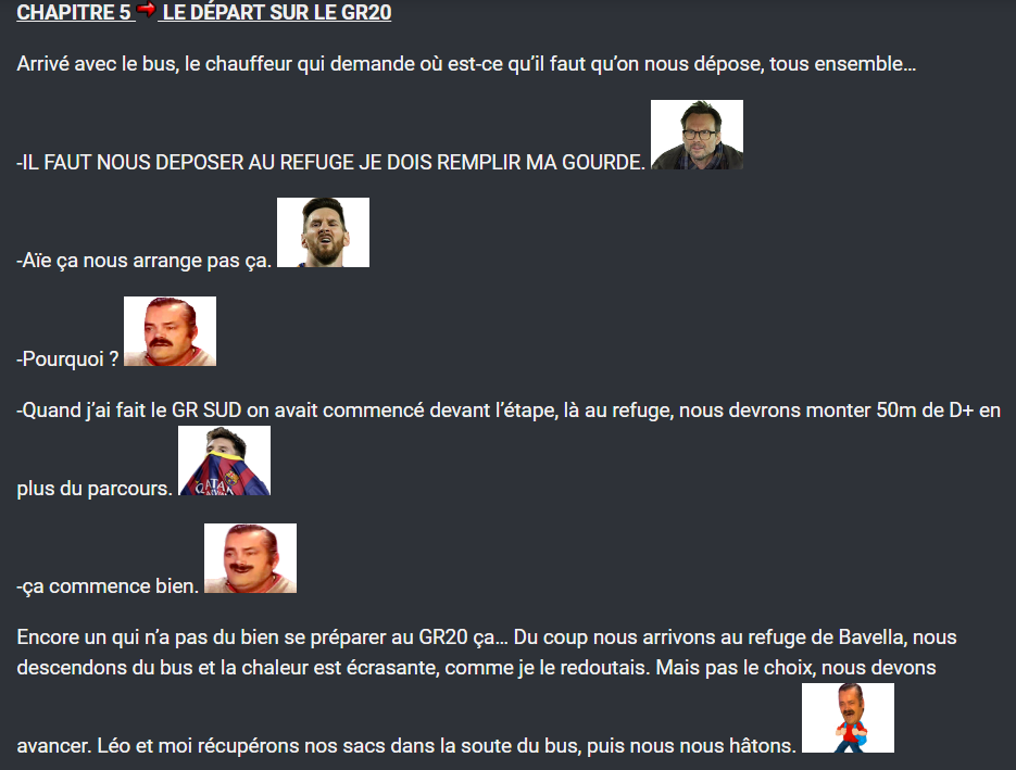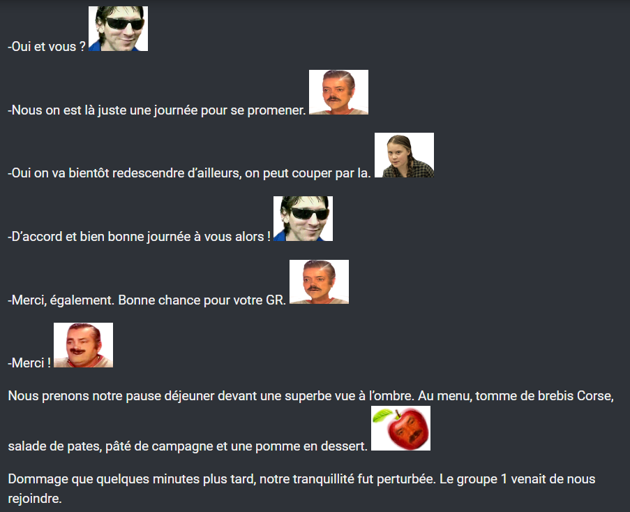 -Oh et puis moi j’ai envie de dire une chose… Le GR20 c’est fatiguant mais… C’est aussi les vacances M**DE ! On va se reposer un peu Célestin, et on partira vers 8h.