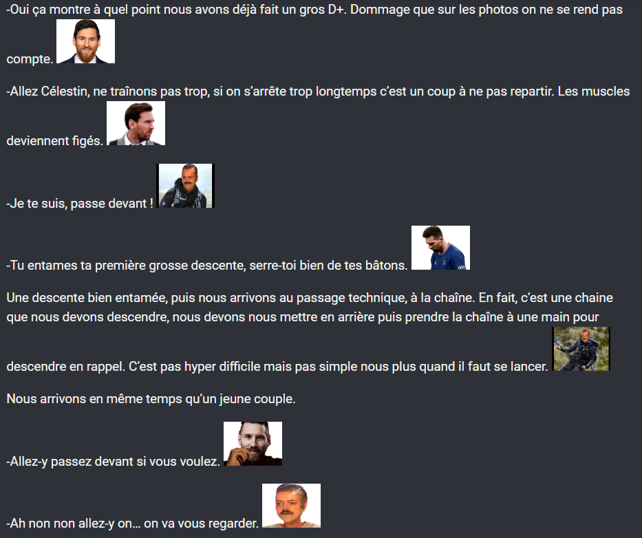 -Surtout que la montée de demain, je m’en souviens encore Célestin. Elle m’avait marqué, on se fera vers les crêtes en 2h de montée. Elle est très raide et très dure.