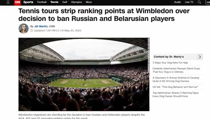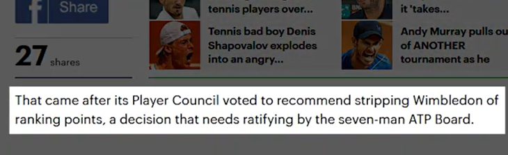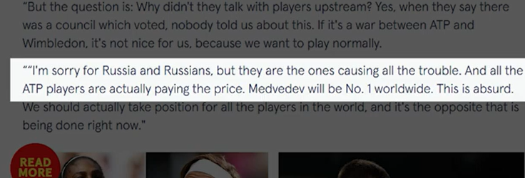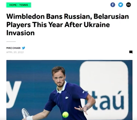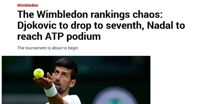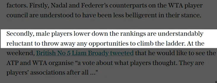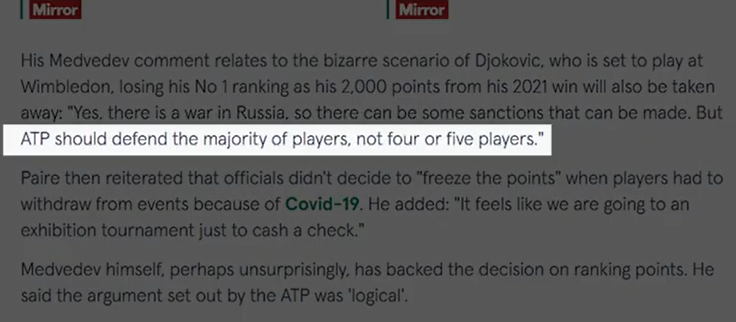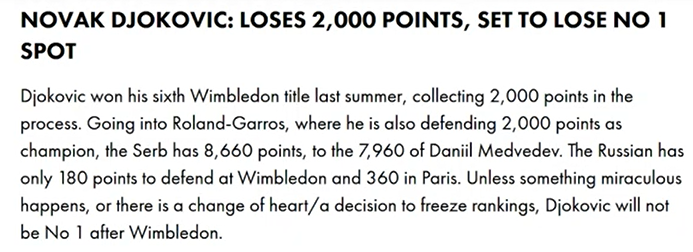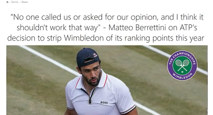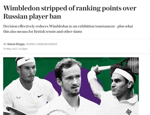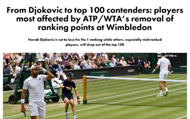 Donc, en gros, Wimbledon a banni les joueurs russes et biélorusses pour sanctionner Poutine. Oui, c'est vrai. Ils voulaient vous faire croire que l'ATP a supprimé les points de classement pour punir Wimbledon. Tout d'abord, supprimer les points de record ne punit pas Wimbledon. Tout comme bannir les joueurs de tennis russes et biélorusses ne sanctionnepas Poutine. Un article du Telegraph du 20 mai 2022 l'a expliqué. Cela n'a aucun effet matériel sur le tournoi car le prix en argent et la chance de remporter un titre du Grand Chelem attireront toujours tous les meilleurs joueurs. En fait, ils ont augmenté le prix en argent à un record de 40 millions de livres pour s'assurer que les joueurs ne manquent pas l'événement. Les organisateurs profiteront du sponsoring, de la participation en direct et des droits de télévision comme ils le font toujours. Et les médias jouent bien sûr leur rôle pour balayer toutes les injustices sous le tapis. Tout comme ils l'ont fait en Australie lorsque Djokovic a été expulsé. Ils glorifieraient l'événement et les gagnants. Si quelqu'un remet en question le caractère légitime de cela, les médias se précipiteront pour le nier. Lorsque Naomi Osaka a déclaré qu'elle pourrait faire l'impasse sur Wimbledon, le porte-parole de l'establishment Brad Gilbert s'est empressé de nous rappeler que Wimbledon a une plus grande importance. Deuxièmement, retirer des points de classement nuit aux joueurs. Tous les joueurs qui ont bien joué l'année dernière, en 2021, n'ont pas eu la chance de défendre ces points. Ils chuteraient au classement. Djokovic, champion de l'année dernière, a perdu 2 000 points. En fin de compte, Djokovic est à 2 000 points de terminer l'année en tant que numéro 1. Berrettini, le finaliste, a perdu 1 200 points. Shapovalov, demi-finaliste, a perdu 750 points, sortant du top 20. Kudla et Piskova ont respectivement quitté le top 100 et le top 10. Et seuls les joueurs de certains endroits peuvent jouer des tournois du Grand Chelem ou des Masters 1000. Et les jouer permet d'avoir plus de chances de maintenir un certain classement. Et des prix en argent. Perdre des points va nuire financièrement à ces joueurs. Seuls les joueurs du top 100/150 gagnent beaucoup d’argent grâce au tennis.