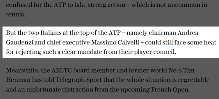 Cela nous amène au point 3. L'ATP n'a jamais eu l'intention de punir Wimbledon. Le tennis devient de plus en plus corrompu. Si l'ATP voulait vraiment punir l'Angleterre ou l'organisation anglaise du tennis, pourquoi n'ont-ils pas supprimé les points ATP de tous les tournois organisés en Angleterre ? Pourquoi n'ont-ils pas déplacé l'événement d'un autre pays après avoir retiré à Wimbledon son statut de Grand Chelem? Si Cincinnati 2020 s'est tenu à New York à cause de la pandémie, alors pourquoi Wimbledon 2022 ne pourrait-il pas se tenir ailleurs. La vérité est que l'ATP et Wimbledon ne se battaient pas mais travaillaient ensemble. L'histoire qu'ils se jetaient l'un à l'autre n'était rien d'autre qu'un théâtre pour le public. L'Angleterre voulait interdire les athlètes russes et biélorusses tandis que l'establishment du tennis voulait détruire Djokovic. Ils obtiennent tous les deux ce qu'ils veulent... à l'époque... Ils ont gelé les points ces deux dernières années à cause de la pandémie. Pourquoi n'ont-ils changé les règles qu'en 2022 ? Nadal, Federer et d'autres joueurs ont conservé des points de Wimbledon 2019, mais ils ne voulaient pas que d'autres joueurs conservent les points de Wimbledon 2021 ? En fait, Federer et Nadal ont tous deux fait pression pour supprimer les points. Selon un article du Daily du 11 mai, le Conseil des joueurs a voté pour recommander de retirer les points de classement de Wimbledon. Simon Briggs a rapporté que le Conseil des joueurs dirigé par Federer et Nadal a recommandé une ligne de conduite agressive. Mais l'ATP a décidé de ne pas suivre la recommandation du Conseil des joueurs car elle serait impopulaire. Mais Briggs a également rapporté que les dirigeants de l'ATP seraient toujours confrontés à une certaine pression pour avoir rejeté un mandat aussi clair de leur conseil des joueurs. Federer et Nadal ont fait pression pour supprimer les points même si la majorité des autres joueurs y étaient opposés.