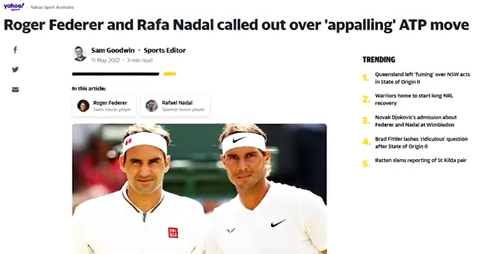C'est une conséquence du fait qu'il a été favorisé au fil des ans : il a voyagé en Australie malgré le covid, Nadal a également sali Novak en Australie au lieu de l'aider, agissant comme il l'a fait pour les points retirés de Wimbledon en tant que joueur du conseil. Des horaires favorables, des injections et des traitements médicaux douteux, des coups politiques dans le dos qui ont tourné en dérision les classements. Tout cela sans faire face à aucun examen minutieux des médias grand public. Même si Federer était également favorisé, il n'a pas agi comme ça, n'a pas simulé de blessures la plupart du temps et a gardé la bouche fermée. En parlant de garder la bouche fermée, certains journalistes auraient dû apprendre de Federer. Comme Benjamin Butterworth. Après la qualification de Kyrgios en quart de finale, presque tous les reportages ont parlé de son procès en Australie. C'était potentiellement une grande distraction pour lui dans son match contre Nadal. Mais pour certaines raisons, après que Nadal se soit retiré du tournoi, les médias grand public ont collectivement perdu tout intérêt pour les problèmes juridiques de Kyrgios. Le Guardian a également publié une histoire dans laquelle Cilic s'entraînait avec Djokovic. Mais ils ont oublié que Berrettini s'entraînait avec Nadal. Lorsque les fans ont dénoncé cette information, les médias ont également abandonné cette histoire.