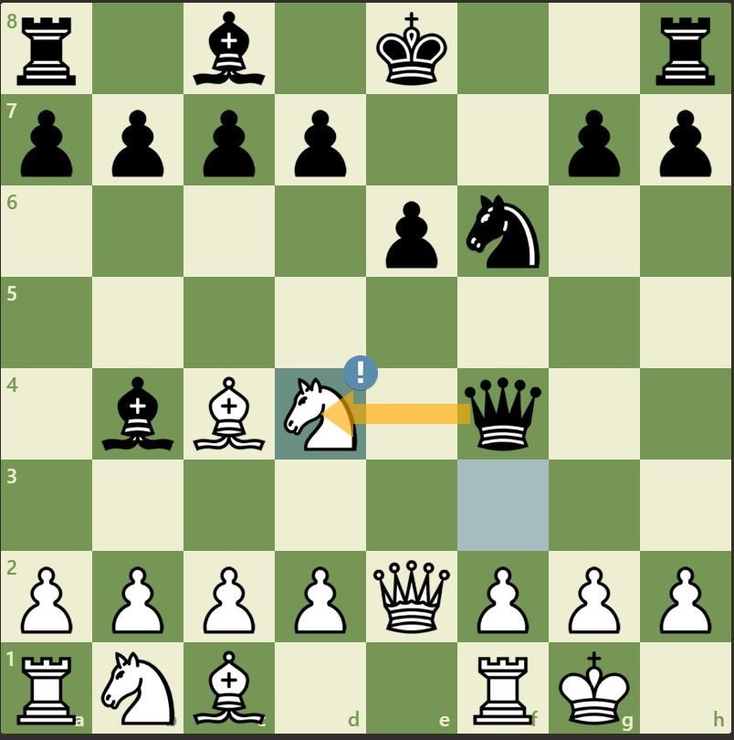 je joue les blancs, le noir a mis son cavalier d4 pour mettre la pression à ma reine, je le prend avec mon cavalier