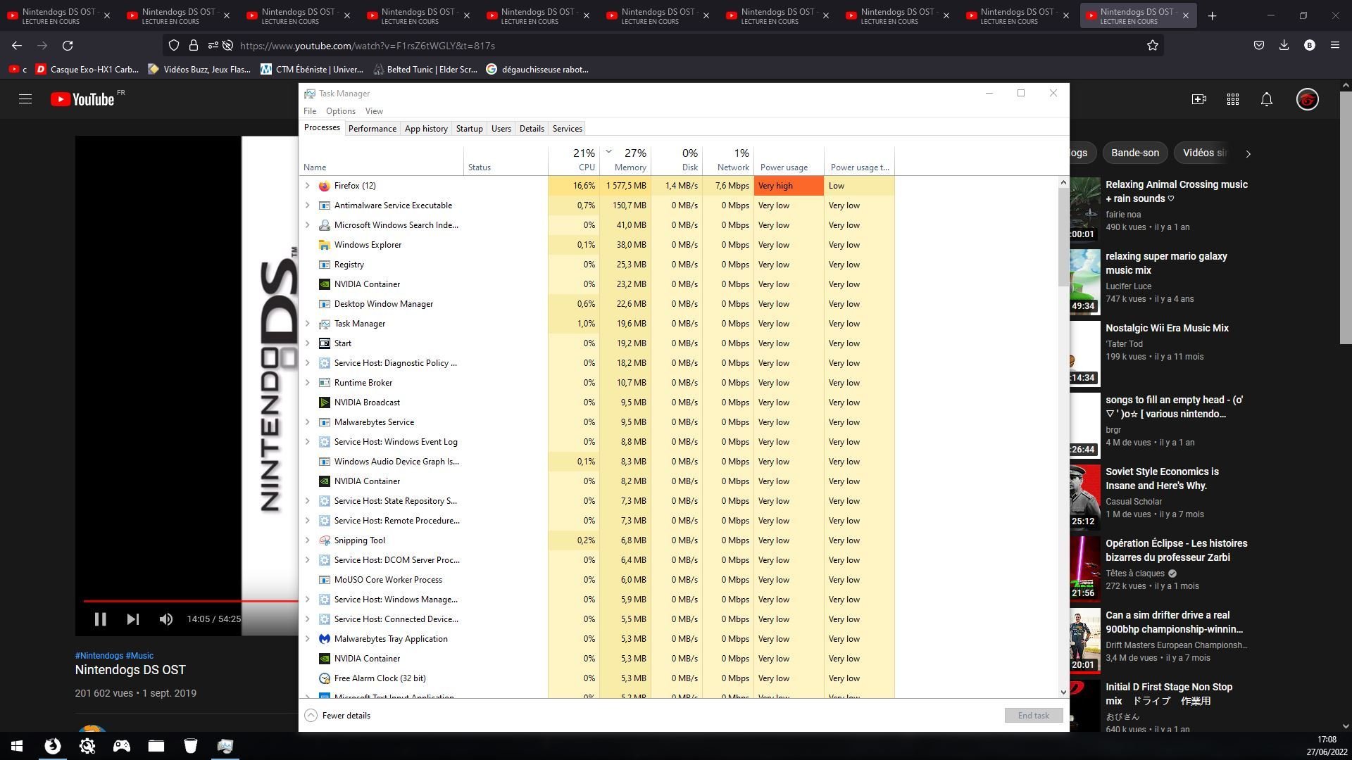 10 onglets YT avec une vidéo qui tourne en fond