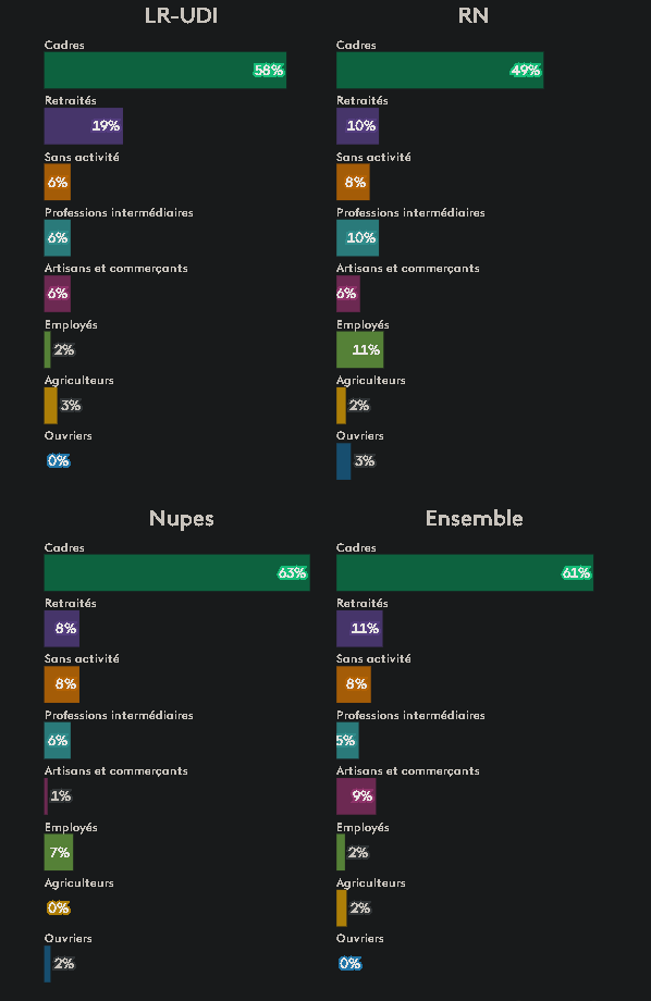 Le RN se distingue cependant des autres partis par une proportion un peu plus importante d'ouvriers, d'employés et de professions intermédiaires. Ces trois catégories cumulées représentent presque un quart des députés RN, contre seulement 15% parmi les élus Nupes, 8% du groupe LR-UDI et 7% des députés Ensemble !.