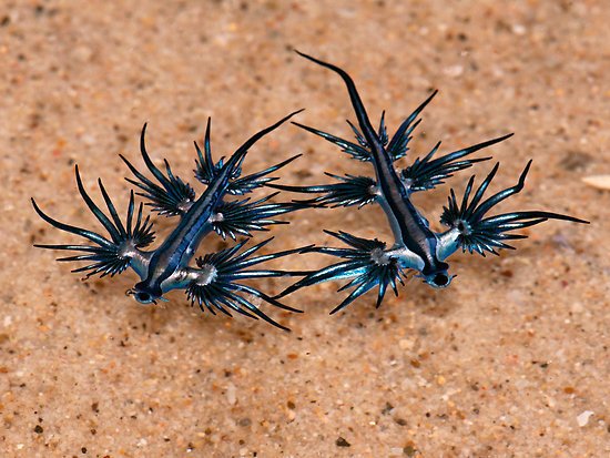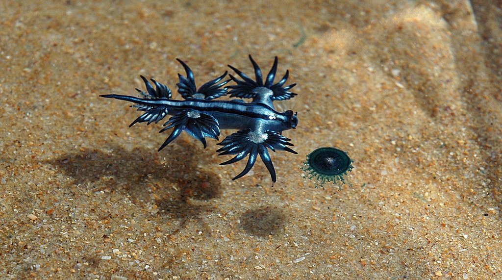 Le GLAUCUS est un cousin des limaces de mer, il vit en flottant à la surface de l'océan et se nourrit d'autres organismes pélagique comme les physalis