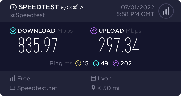 Et vousent ?Ethernet 2,5 Gbps —> Speedtest 2100/800 mon grand