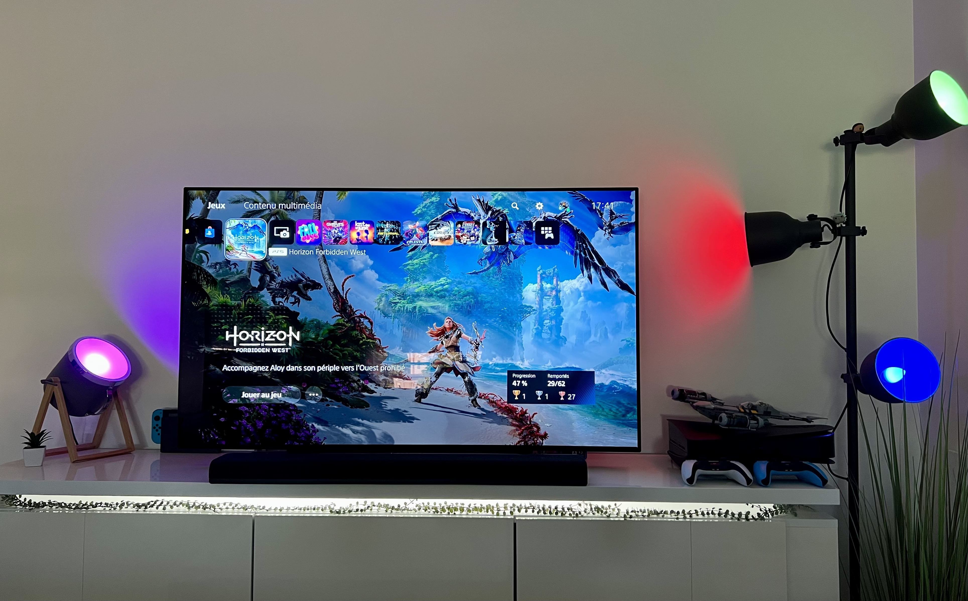 Le salon de tati jeanette avec une PS5 branchée et des ampoules de couleur pour faire geek 1/20