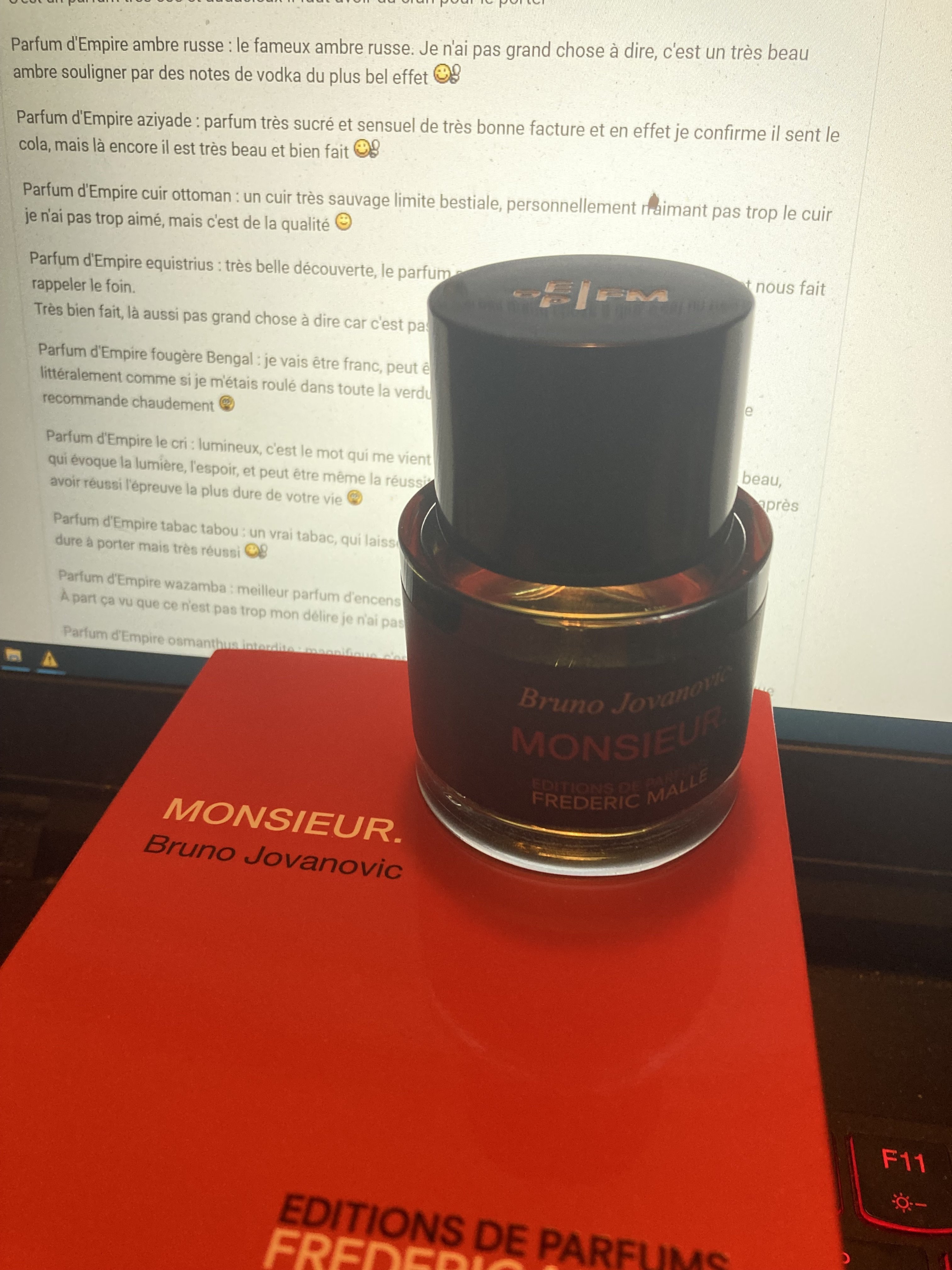 En vacance à Montpellier, j'en ai profité pour faire un petit tour à la parfumerie "Qu'importe le flacon" petit magasin très sympathique avec des références tel que Frederic Malle, Olfactive Studio, Serge Lutens, Goutale, Artisan Parfumeur, entres autres.J'ai évidemment acheté ma petite bouteille de 50ml de Monsieur de Frederic Malle , pour moi c'est un parfum fait pour les temps froids qui s'annoncent.