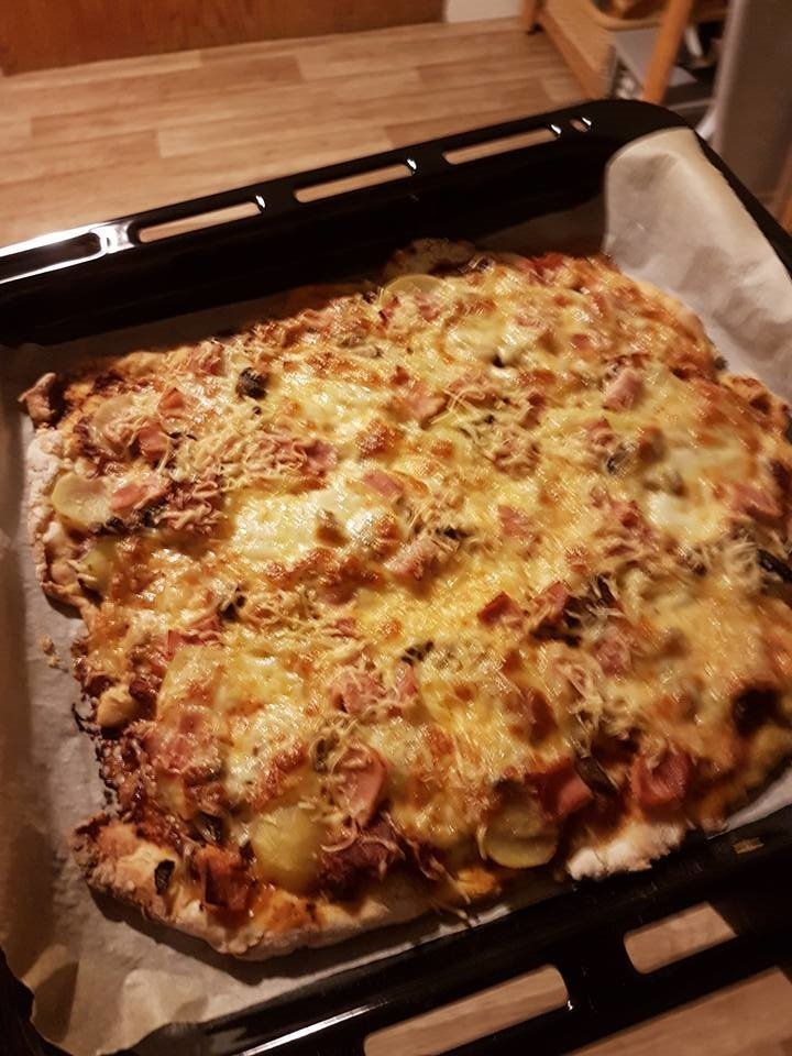 Sinon voici ma garniture imbattable : sauce tomate maison avec oignons ail et poivron finement coupés, des lardons bio à pré poêler, et des morceaux fins de pomme de terre décortiquées et cuites à l'eau évidemment ! Il ne reste plus qu'à couvrir le tout de morceaux généreux de mozza di buffala bio et à enfourner à 200° entre 15 et 20 minutes (à surveiller, c'est prêt quand la mozza est bien étalée et que ça commence à dorer).