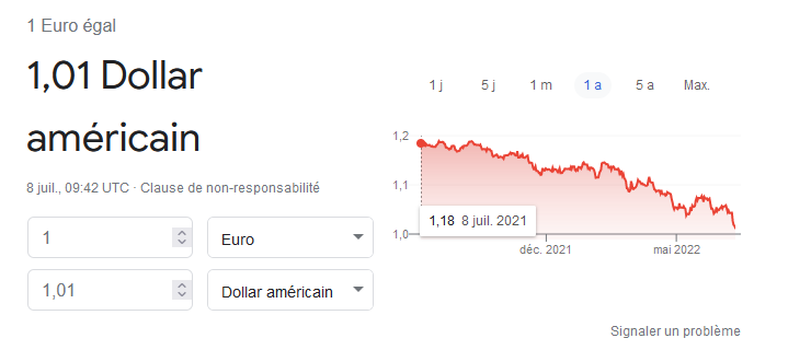 Dans un contexte inflationniste fort, c’est une mauvaise nouvelle de plus pour les consommateurs car la chute de la monnaie européenne pourrait amplifier la baisse du pouvoir d’achat des Français.
