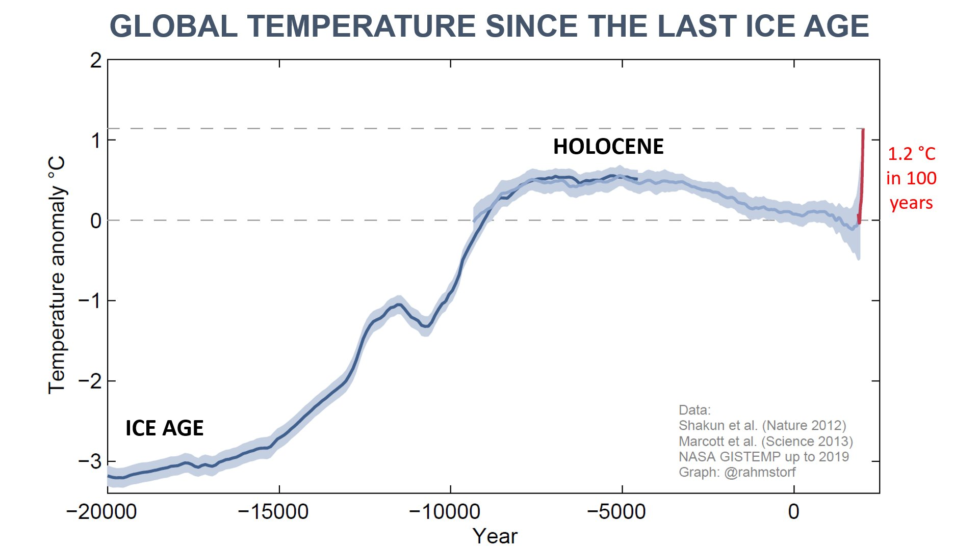 Voilà la courbe de température depuis les 20000 dernières années (donc depuis la dernière grosse montée de température pour comparer un peu) : https://pbs.twimg.com/media/EWYZ3p3XgAED7Qt.jpg:large