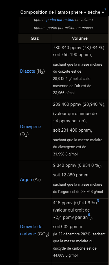 Dioxyde de carbone (CO2) 416 ppmv (0,041 6 %)8 (valeur qui croît de ~2,4 ppmv par an9),