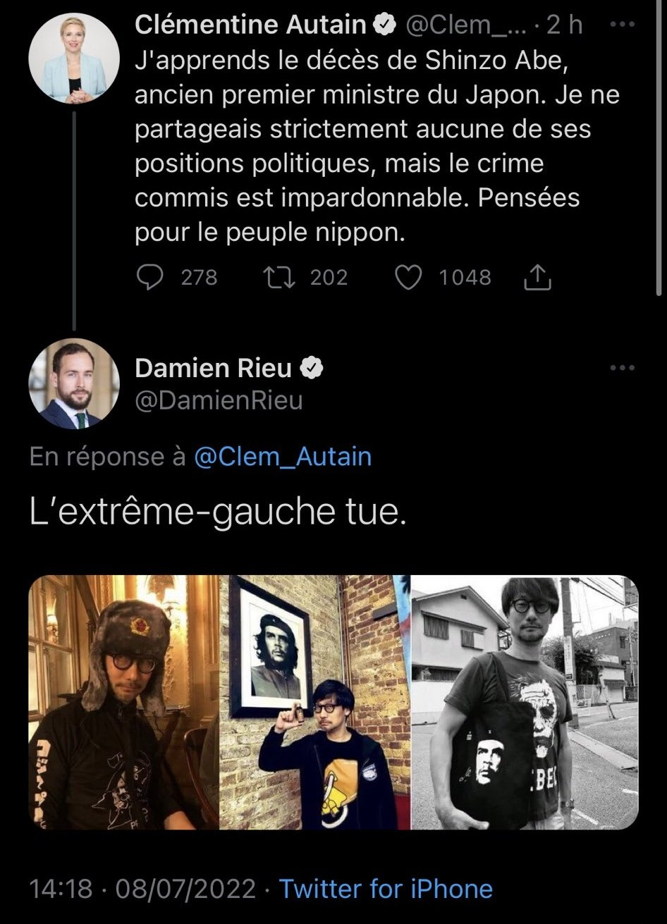J'ai dis : Et ? Hideo Kojime reste un crasseux d'extrême gauche qui célèbre Che Guevara, dans un pays normal il serait en prison.On attend la liste des hommes politiques historiques que tu célèbres… juste pour rire
