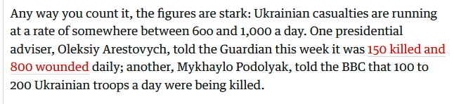 Oui et si tu lis la ligne d'en dessous on parle de 100/200 morts ukrainiens/j ce qui est bcp plus réaliste
