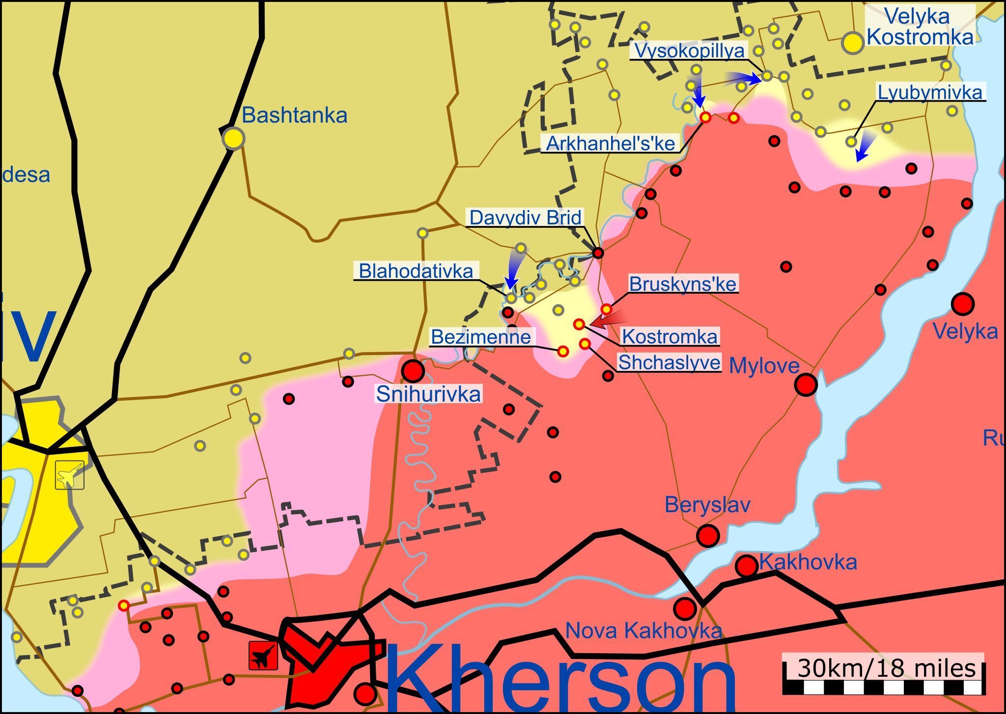 la plupart des villages qui constituaient il y a qq jours la poche d'Andreevka (en fait au sud de ce village) ont été repris. Les ukrainiens ne gardent que quelques pontons au sud de l'ingoulets d'où ils espèrent encore percer