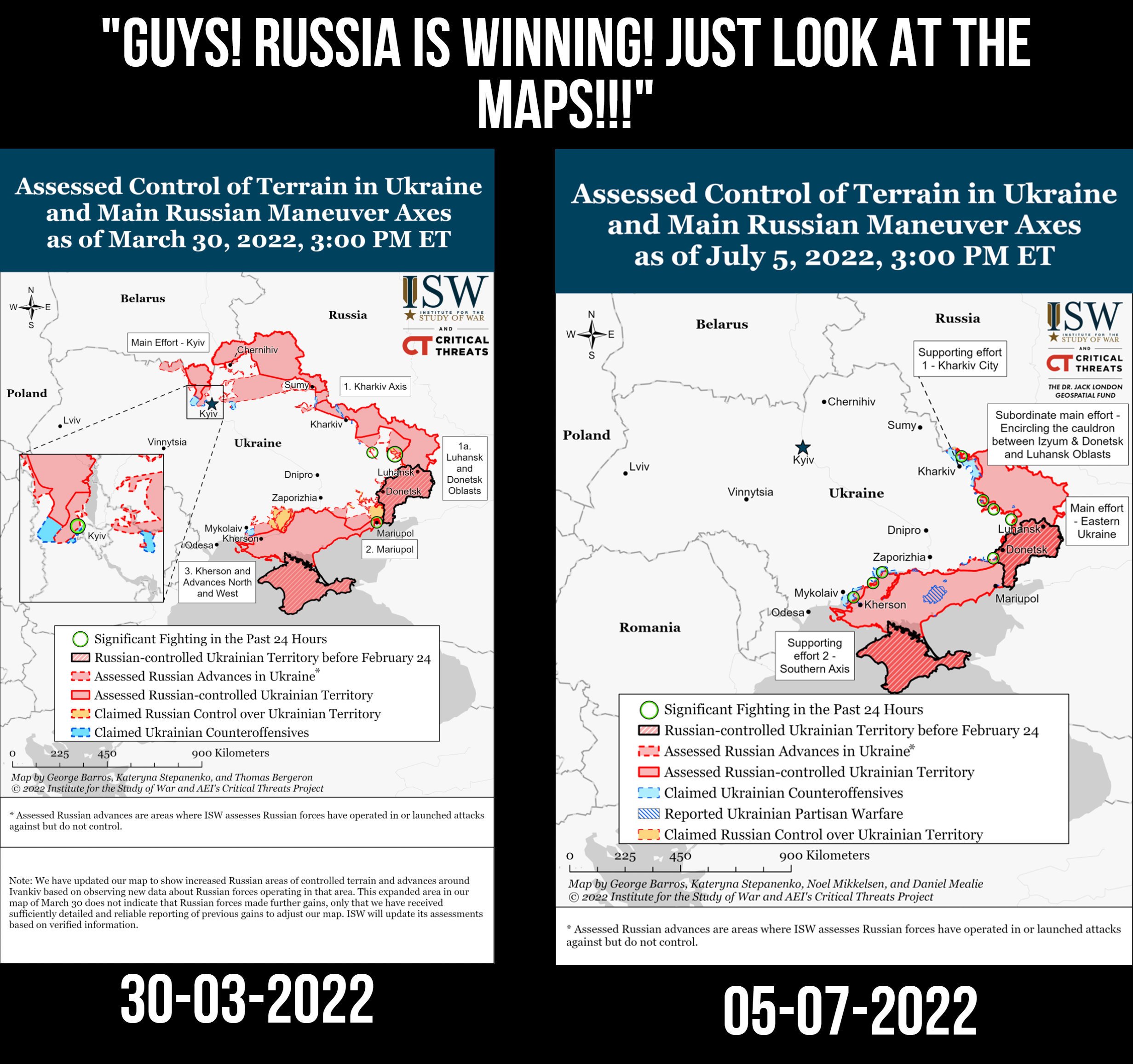Quand je disais un résumé , c'était plus dans le sens qui l'emporte militairement sur le terrain ?Selon ces cartes, ça signifierait que les Russes ont abandonné le Nord pour solidifier l'Est et le Sud ?