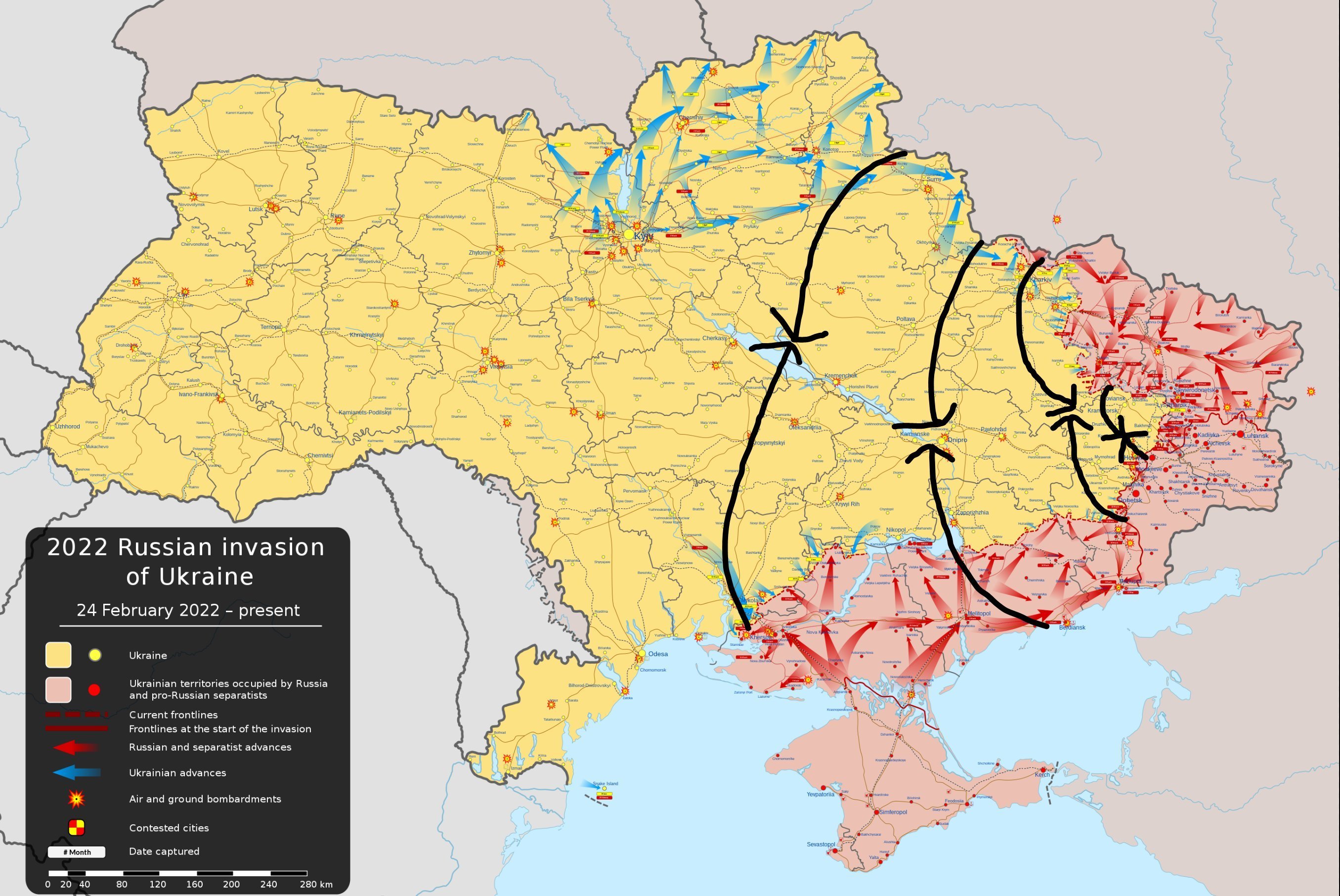 Les plans successifs d'encerclement depuis février à mesure que les poutibots comprennent à quel point l'armée russe a la logistique et la puissance d'une armée du tiers monde