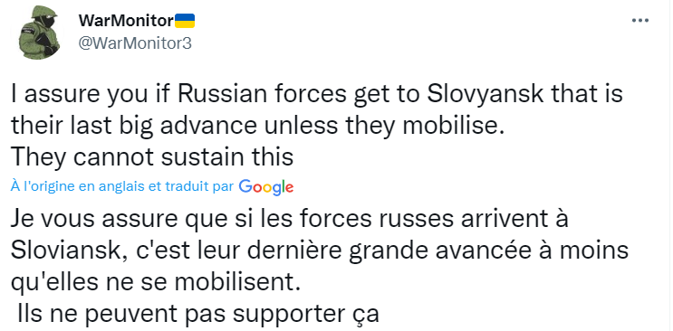 « Siversk has been liberated by L/DPR forces, but how? Simply through Ukraine abandoning positions. And that’s a town with 10,000 population. Such slow advance is senseless and will lead to a war dragging out for 5-10 years easily. » (après faudra confirmer pour Siversk, j’ai rien vu de fiable pour le moment)
