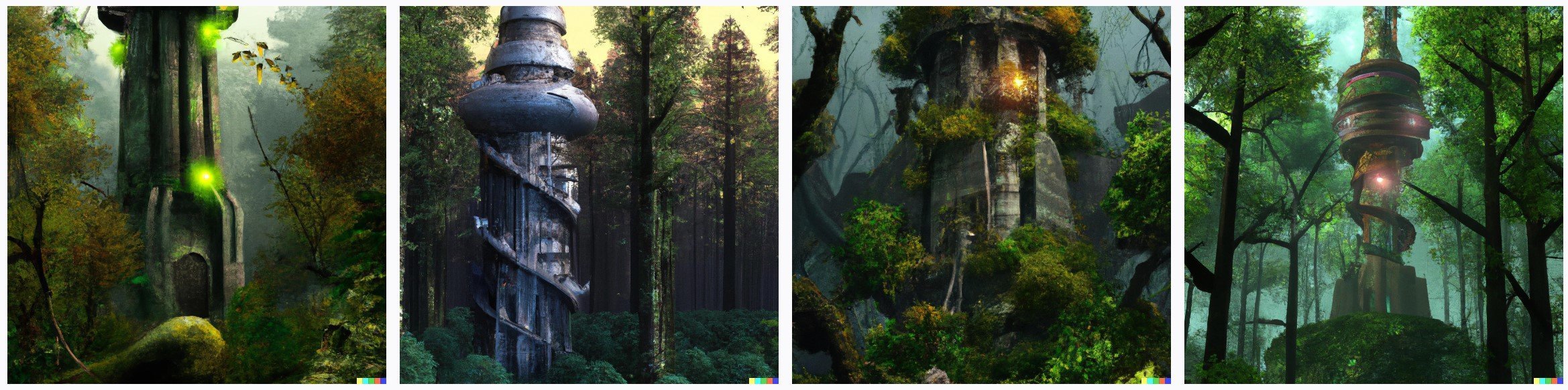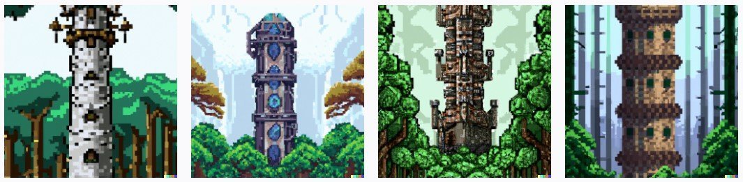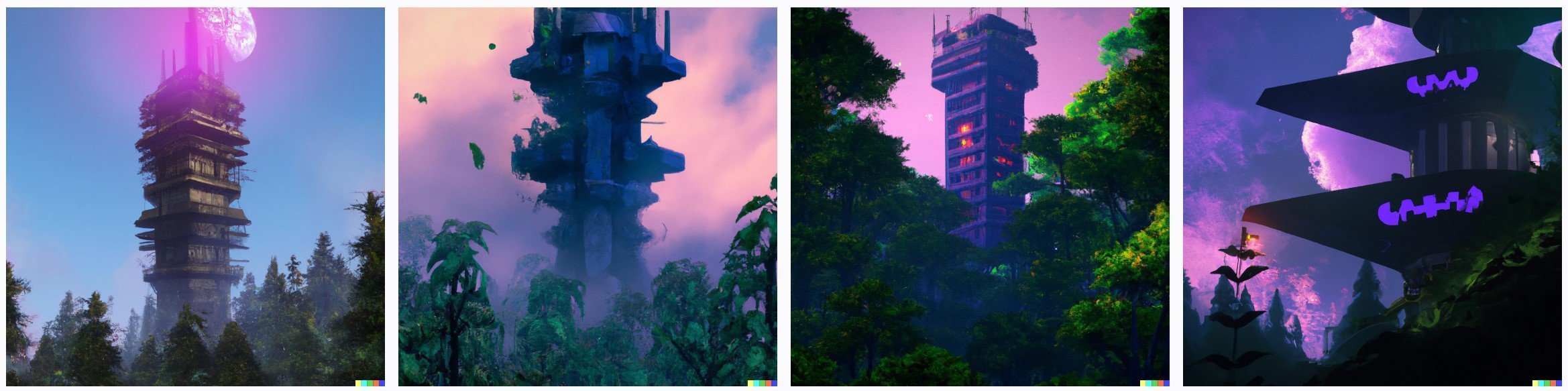 "Gigantic fantasy tower in a dense forest"J'ai tapé la même chose, mais j'ai rajouté ", retrowave"