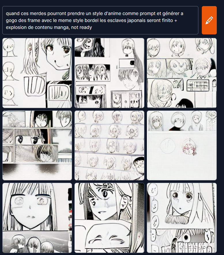 quand ces merdes pourront prendre un style d'anime comme prompt et générer a gogo des frame avec le meme style bordel les esclaves japonais seront finito + explosion de contenu manga, not ready![]()