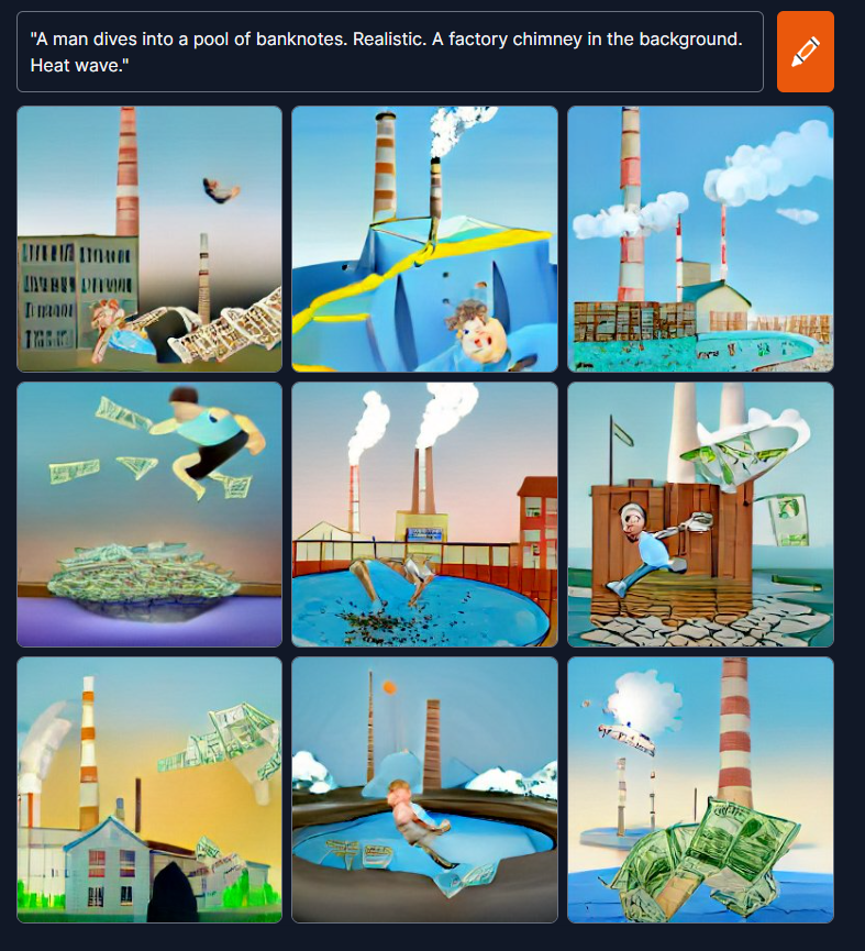 Le 24 juillet 2022 à 16:09:49 :"un homme plonge dans une piscine de billets. Realiste. Une cheminée d'usine en fond. Canicule."
