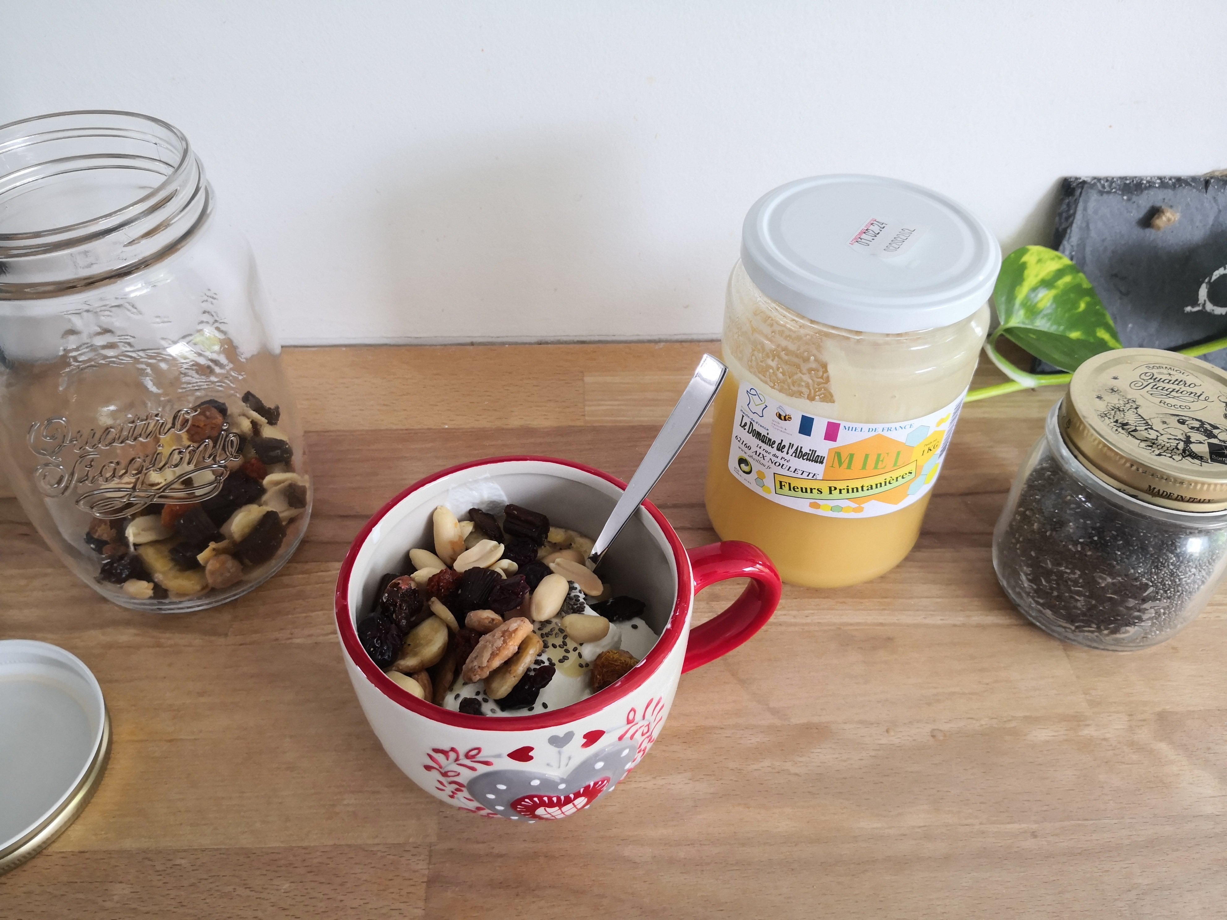 Fromagent blanc, miel de fleur de printemps, graines chia, et mélange de fruits secs ent's.