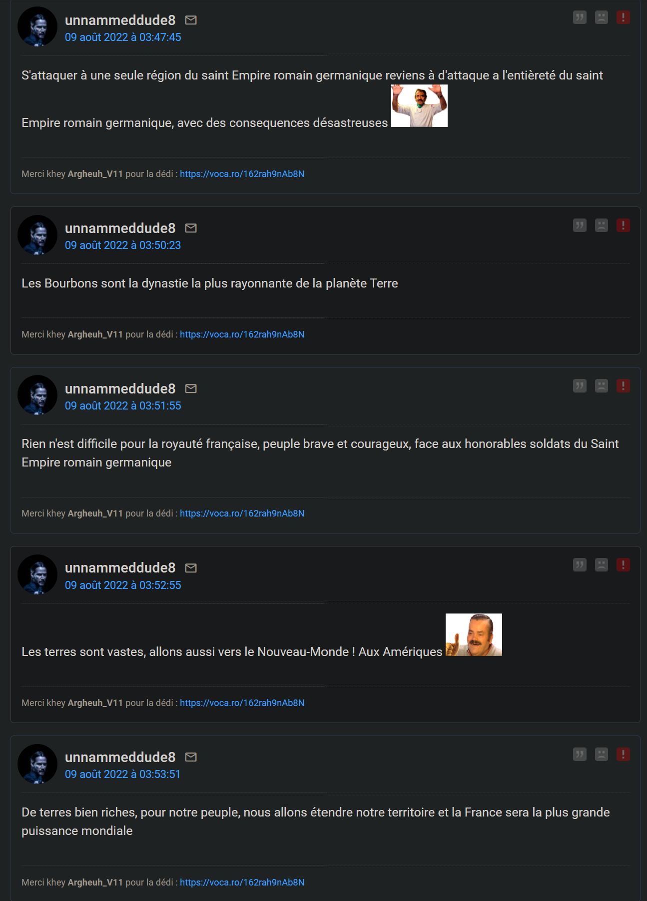 Pour le contexte, les faits datent d'hier: j'ai crée un topic qui est devenu un blabla, puis on s'est dit bonne nuit comme il se faisait tard mais ce khey visiblement ravagé a continué à boucler sur plus de 2 pages tout seul, tenant des propos incohérents