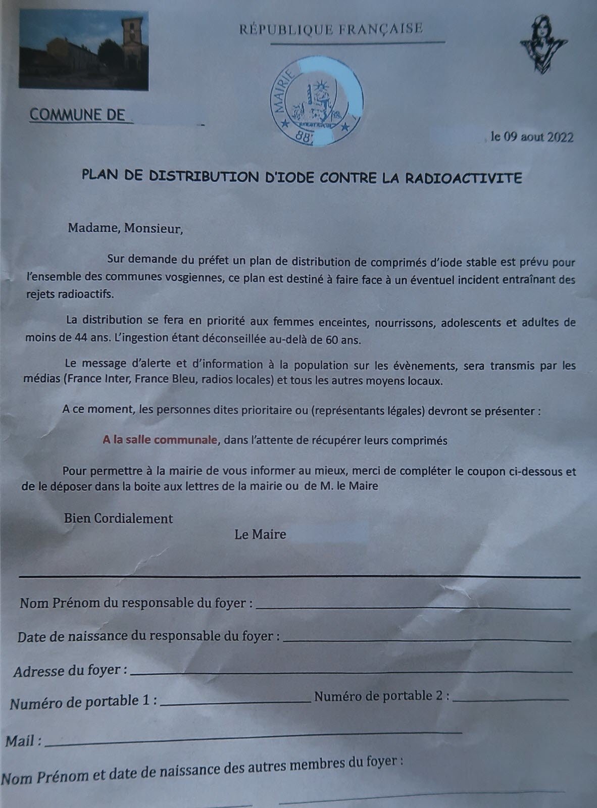 Le préfet des Vosges donnent des pastilles d'iodes dans une région DÉPOURVUE de CENTRALE NUCLÉAIRE. Il y a 0 centrale dans les vosges, 0, nada et ils donnent quand même des pastilles d'iodes.