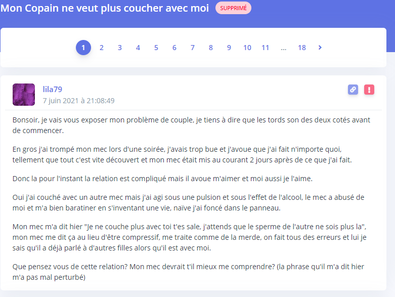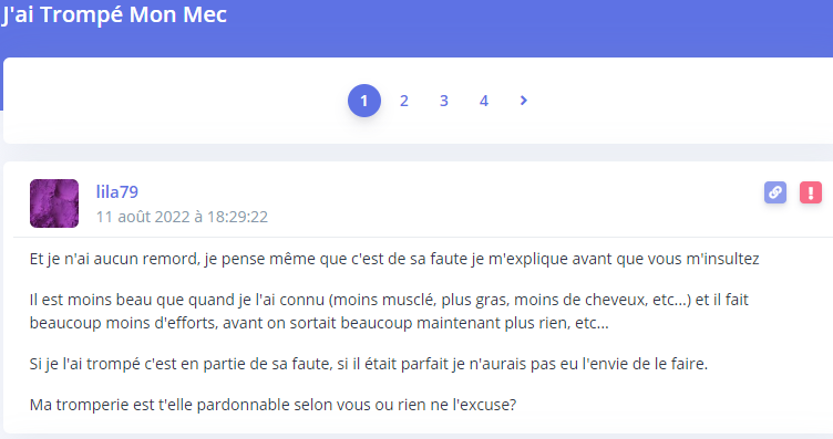 Bon après une petite recherche, j'ai la preuve que l'op est un troll.Première fois elle l'a trompé et découvert: