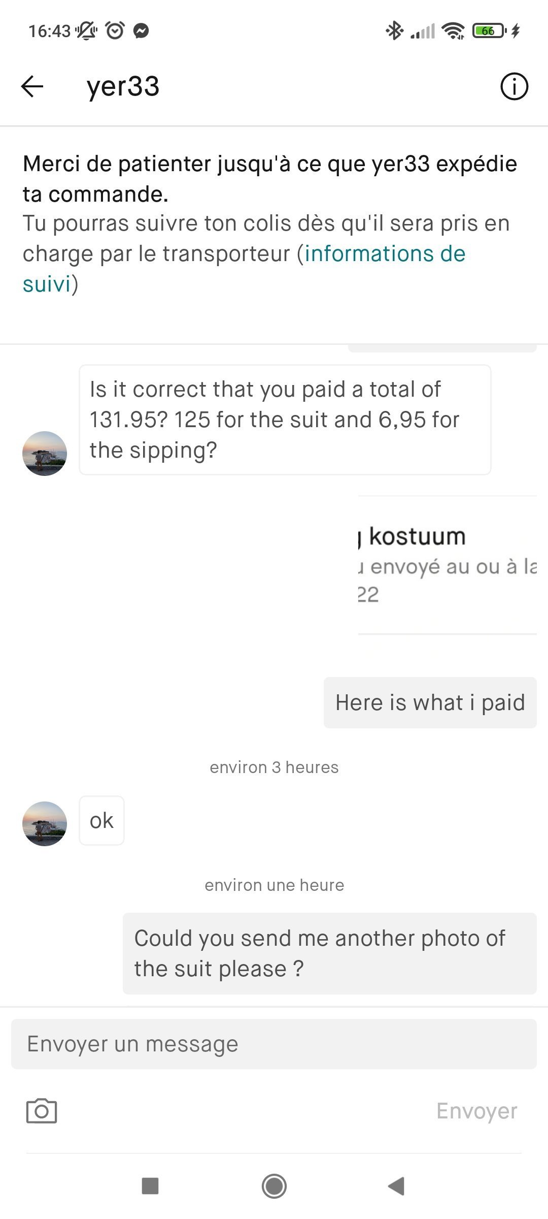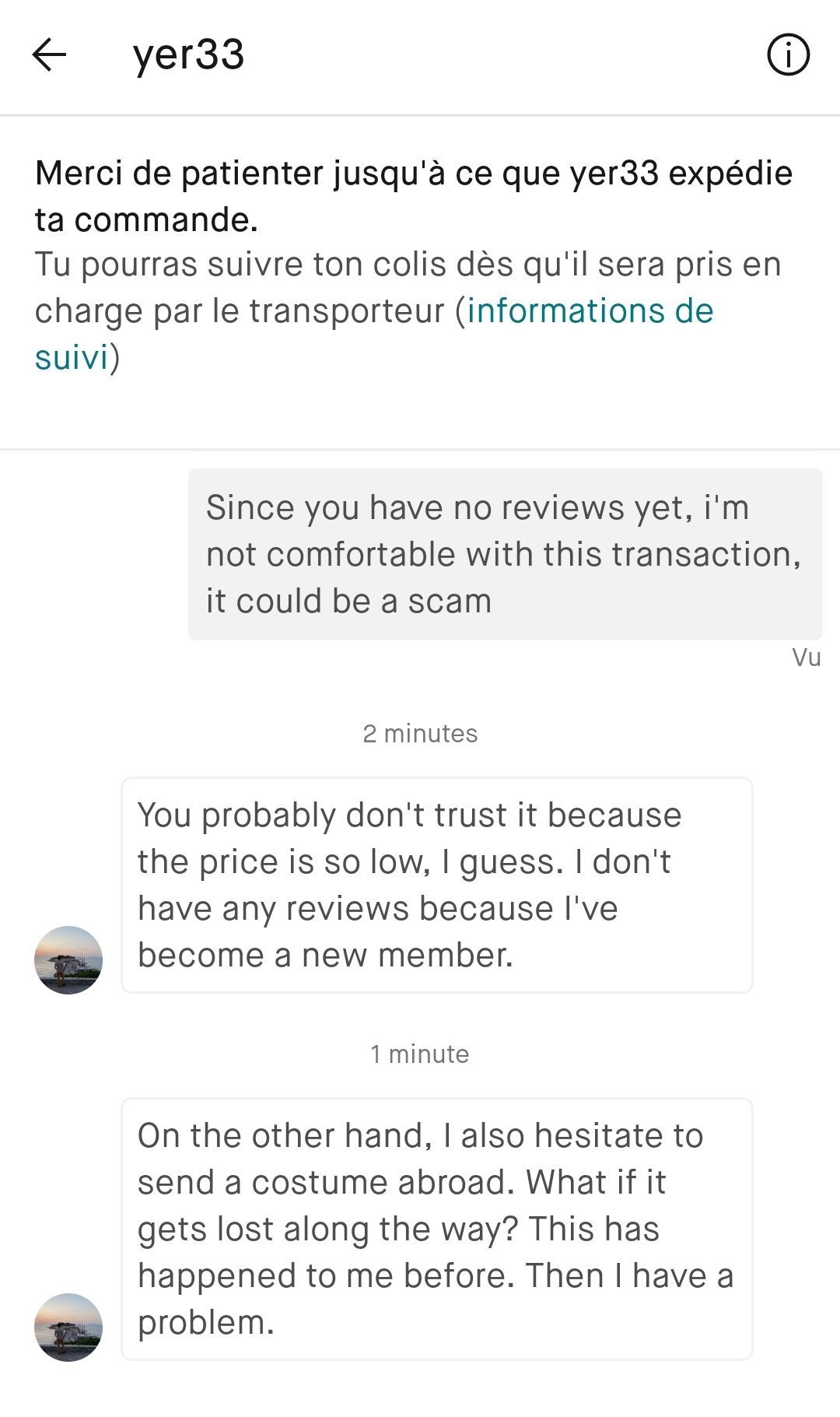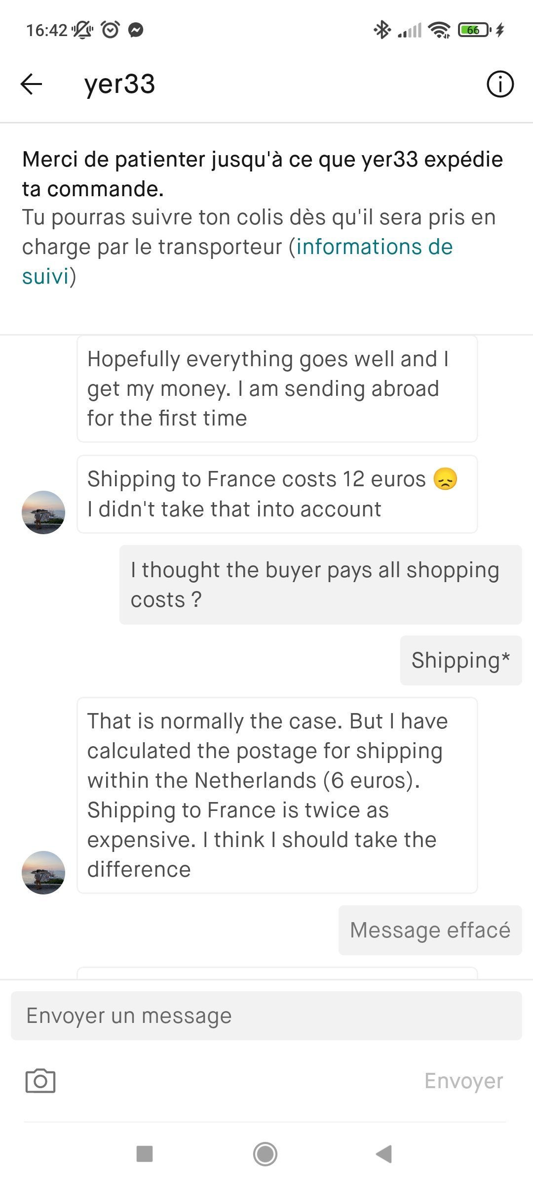 Je veux acheter un costume que j'ai repéré, le vendeur vient des pays bas et me sort des trucs chelou, comme quoi il doit payer 12 euros de frais de port pour envoyer des pays bas jusqu'en France (alors que c'est l'acheteur qui paie les fdp non ? J'ai payé 6euros dans le prix ). Et maintenant il veut pas m'envoyer le colis car je suis à l'étranger