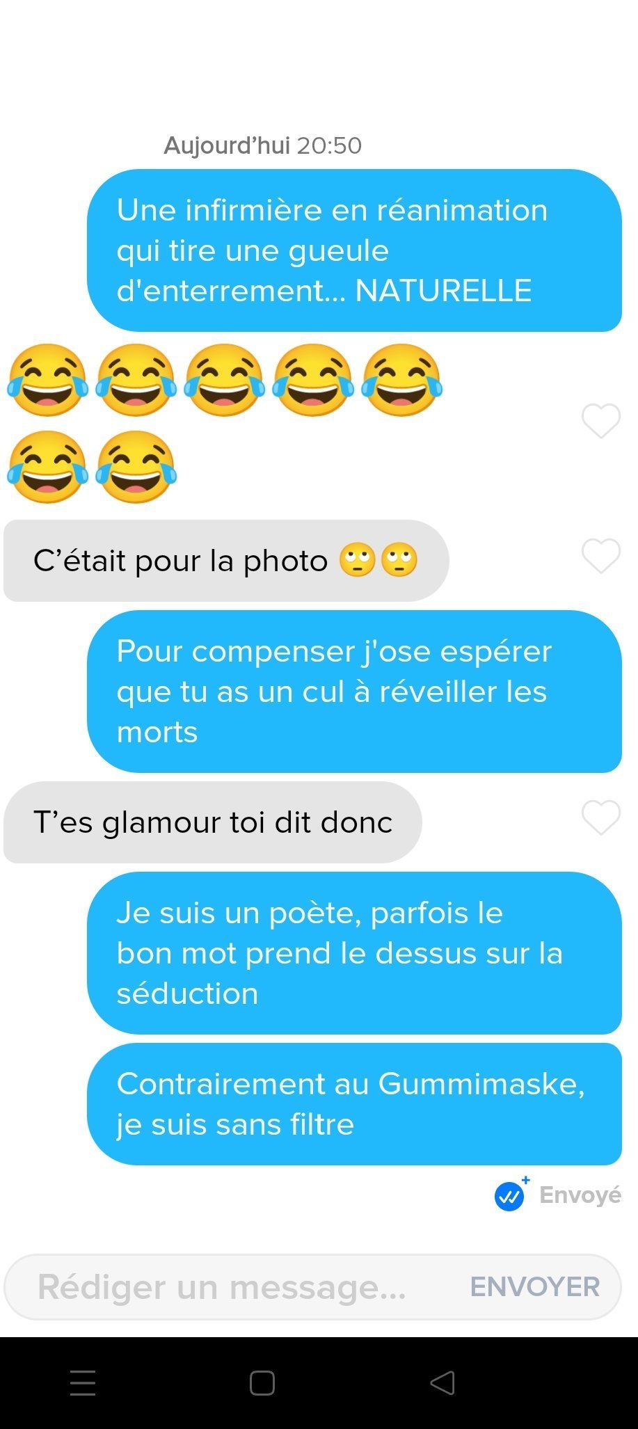 L’op t’es un dieu je ris à gorge déployée depuis tout à l’heureDis moi outre les photos que tu as pu mettre, t’as mis quoi comme type de bio pour qu’elles tombent dans ce piège savamment orchestré ??