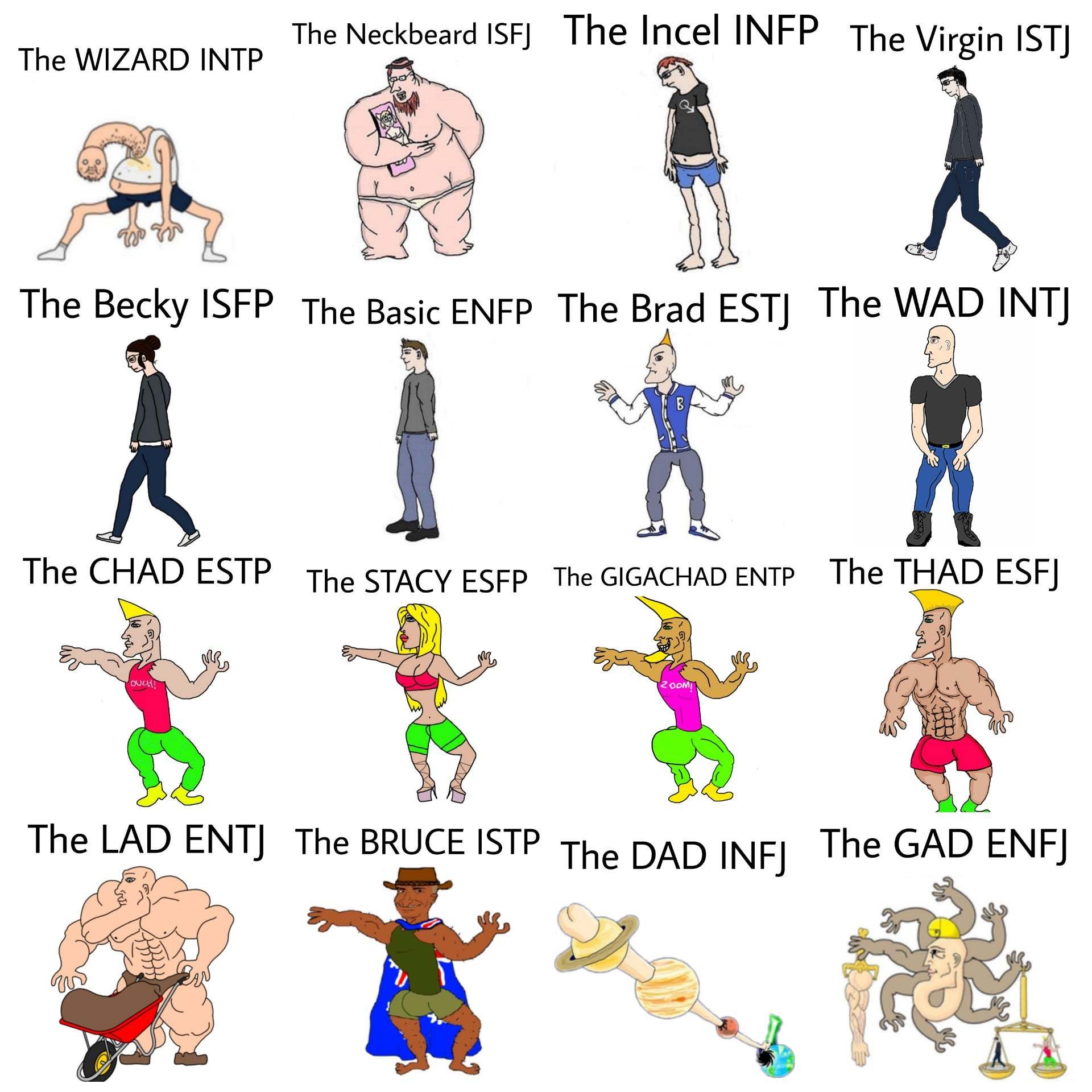 Chad ESTP < Stacy ESFP < Gigachad ENTP < Thad ESFJ < Gad ENFJ