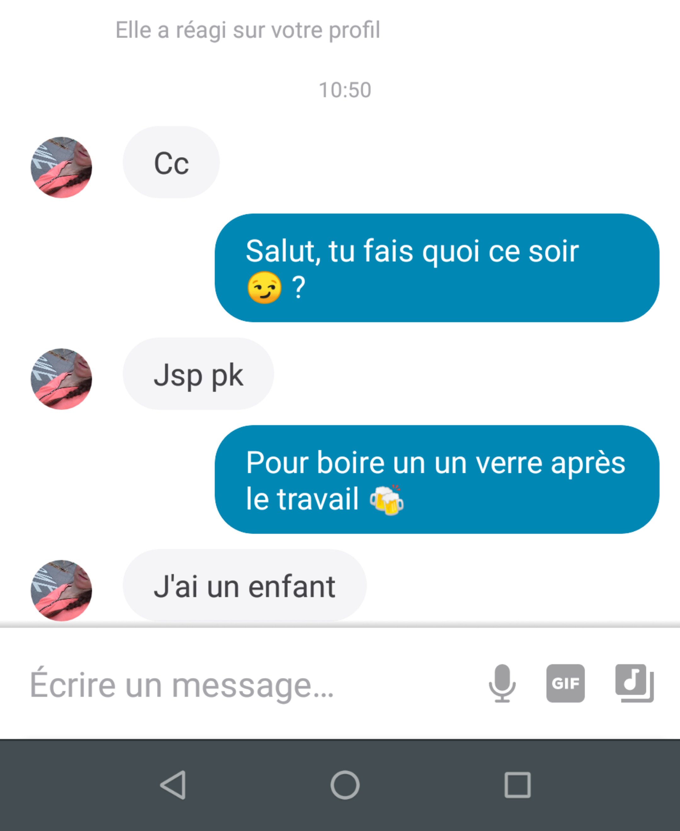 Non rien que niveau expression écrite on est au-dessus du lot. Sans déconner, comment tu peux t'estimer être l'égal de quelqu'un qui écrit "cc", "jsp pk" et qui n'est même pas foutu d'écrire correctement son prénom