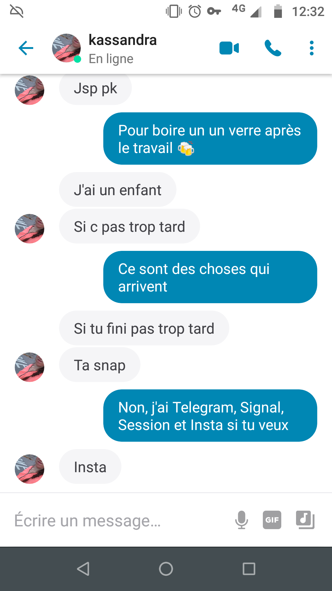 ) qui pue la prolotitude. Photo de profil avec une sorte de veste de jogging, prénom "kassandra", son premier message c'est "cc"
