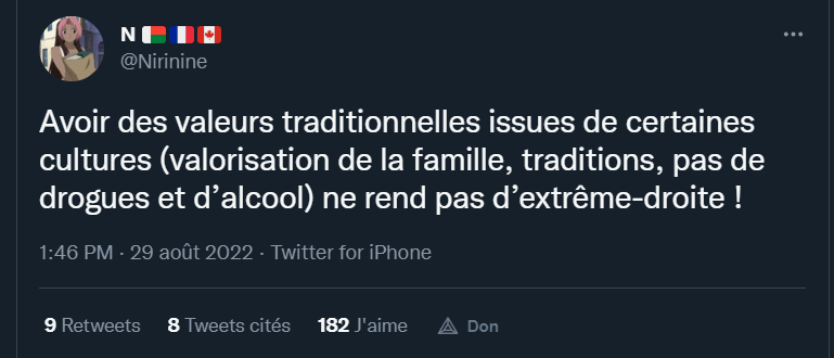 Vous vous rappelez de la meuf de science po qui insultait tout le monde de raciste et compagnie Bha aujourd'hui c'est à son tour de goûter à ça https://twitter.com/Nirinine/status/1564992645100969989 Il lui est reproché d'avoir dit qu'on peut être de gauche et avoir des valeurs tradi