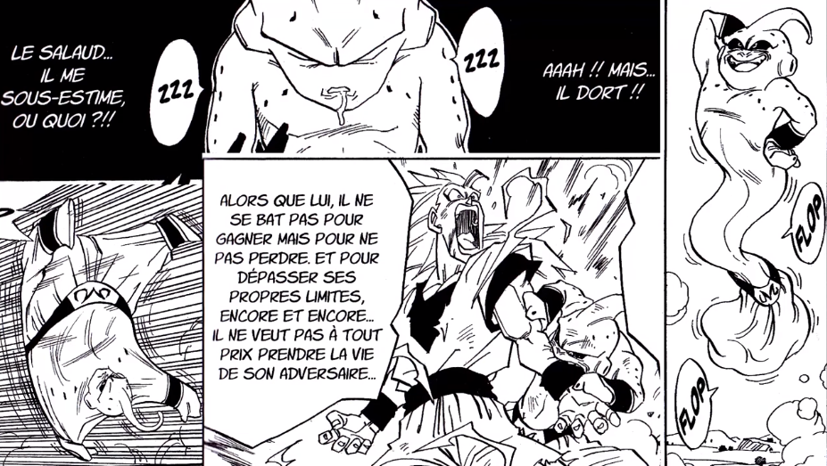 Dans le manga c'est pareil, kid buu danse, dort pendant le combat, mord goku