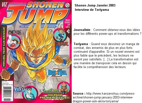 Toriyama : Quand vous dessinez un manga de combat, des ennemis de plus en plus forts continuent d'apparaître. Si un nouvel ennemi est plus faible que le précédent, les lecteurs ne seront pas satisfaits. La transformation est une manière de transposer cela en dessin qui facilite la compréhension des lecteurs.