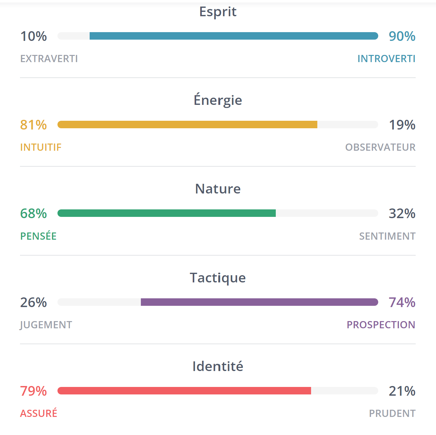 Personne ici n'.a fait de test pour valider son MBTI, ces batteries de test prennent plusieurs jours et se confirment ensuite avec un psychiatre par des exercices et des conversations sur la base du principe d'autovalidation de Jung, vous êtes juste allés consulter la page wikipédia du MBTI pour séléctionner le type psychologique qui vous convenait, bien évidemment parmi les moins distribués, comme à chaque topic de ce genre, car en bons lambdas vous voulez tous vous sentir spéciaux comme vous pouvezNon j'ai juste fait des tests sur des sites, ça m'a donné ça