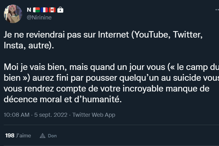Le camp du bien qui envoie des menaces de mort, incitations au suicide, à la violence.