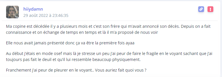 J’ai inversé le sexe de tout le monde dans ce topic, j’avais peur que sa sœur soit sur le fofo