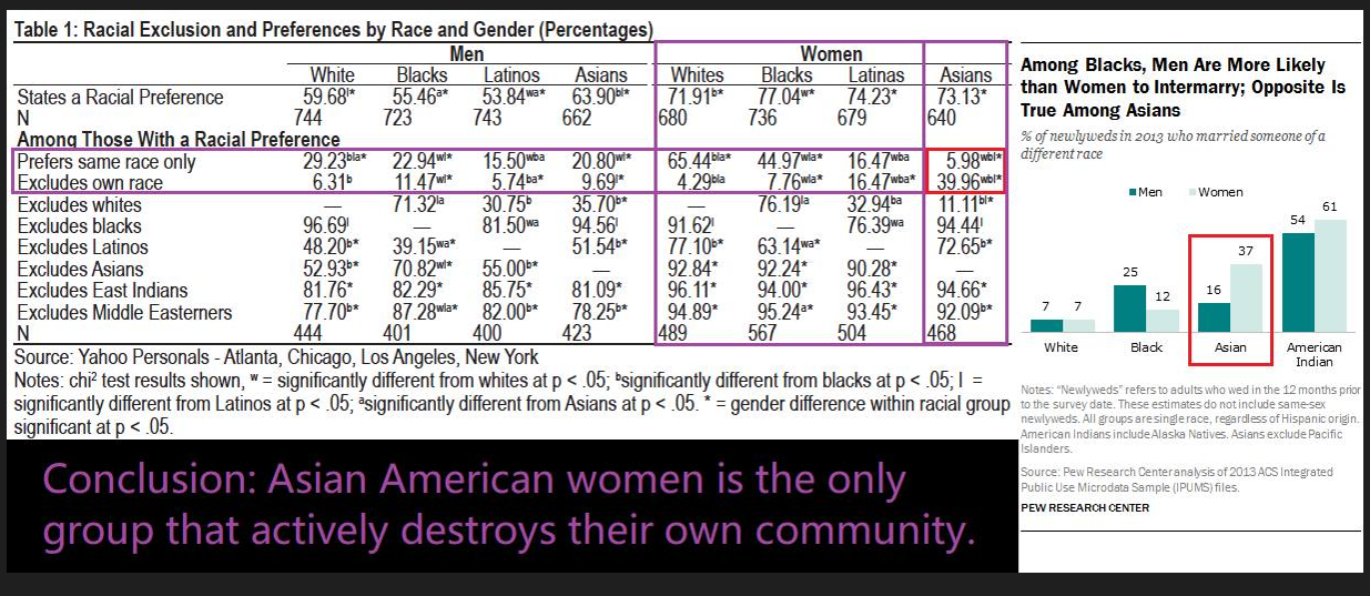 c'est clairement spécifique aux femmes asiatiques de se marier avec des hommes d'autres racej'ai parlé avec des centaines d'asiat, une majorité préfèrent les mecs étrangers, soit caucasiens, soit renois