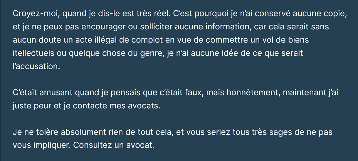 Croyez-moi, quand je dis-le est très réel. C’est pourquoi je n’ai conservé aucune copie, et je ne peux pas encourager ou solliciter aucune information, car cela serait sans aucun doute un acte illégal de complot en vue de commettre un vol de biens itellectuels ou quelque chose du genre, je n’ai aucune idée de ce que serait l’accusation.