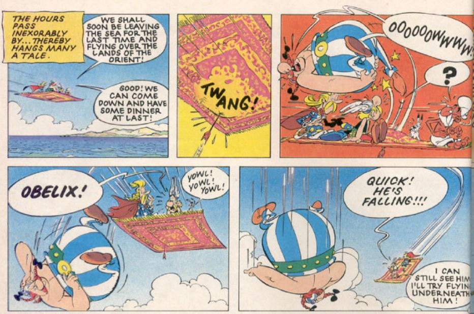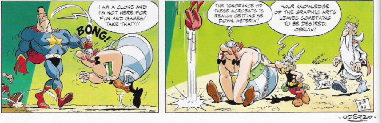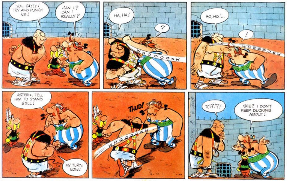 Obélix est clairement incapable de le toucher il lui demande même de rester immobile et est choqué de se faire esquiver à chaque fois, même Astérix lui dit qu'il est lent