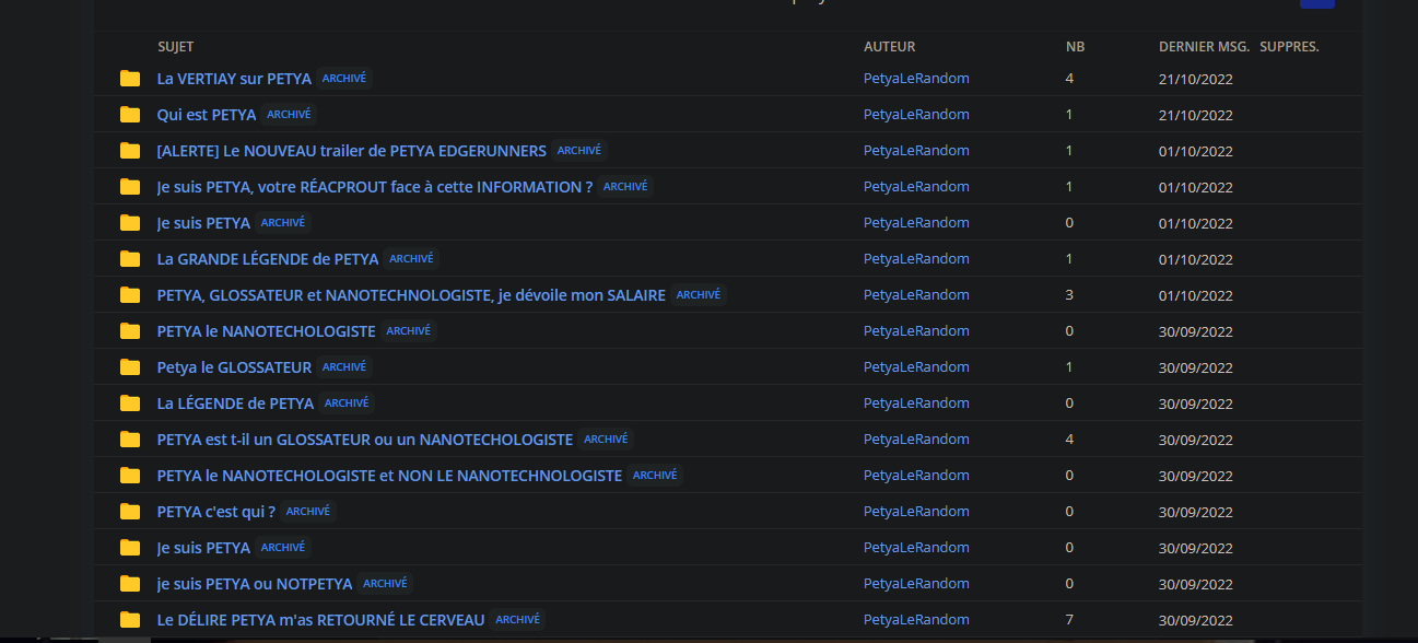 Le 18 septembre 2022 à 16:44:31 :Le 18 septembre 2022 à 16:43:42 :Le 18 septembre 2022 à 16:42:52 :Le 18 septembre 2022 à 16:39:00 :Le 18 septembre 2022 à 16:34:32 :C'est qui Petya ?C'est PETYAEt bien maintenant c'est moiUn fake de moi ?!!Bah non mais fallait prendre ce pseudo aussi