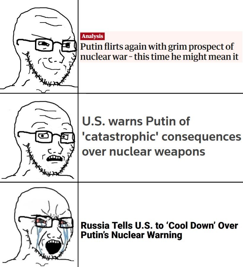 Là par contre, j'y crois pas un seul instant, si la Russie utilise la nuke, peut-être qu'il n'y aura pas de réplique nucléaire de la part de l'occident, mais la Russie perdra son siège à l'ONU (conseil de sécurité), même la Chine et d'autres pays qui ont une posture de neutralité pour ne pas froisser la Russie les lâcherait. Elle se couperait à jamais du monde. Ça deviendrait une Corée du Nord bis.Elle va annexer des territoires, utiliser la menace nucléaire parce qu'elle n'a plus les moyens de se défendre face aux contre-attaques en disant "là c'est notre territoire maintenant, ne franchissez pas" et faire accepter par la menace nucléaire l'annexion de ces territoires (je dis bien accepter, pas reconnaitre) comme la Crimée